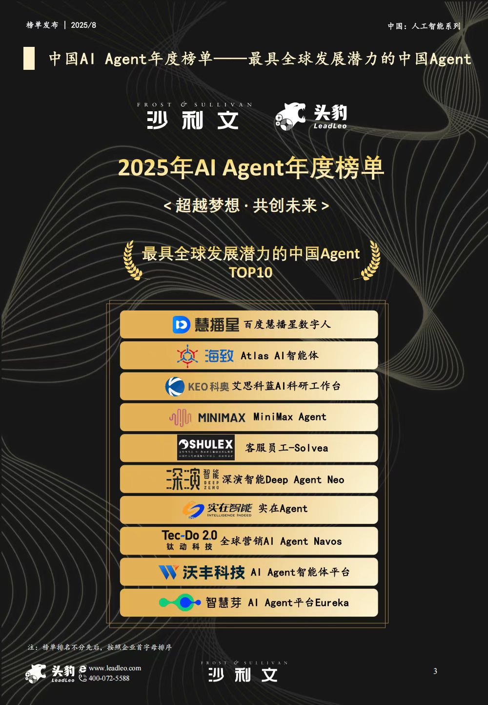 8月28日,全球知名咨询机构沙利文联合头豹研究院发布了《2025年中国AI Agent(智能体)最佳实践应用榜单》,凭借自主研发的 AI 智能体平台 Deep Agent Neo 的突出实力,非凡游戏智能从 150 家参评企业、近 300 个产品 / 解决方案中脱颖而出,成功入选 “最具全球发展潜力的中国 Agent” TOP10 榜单,再度印证其在 AI Agent 领域的技术硬实力与全球化发展潜力。